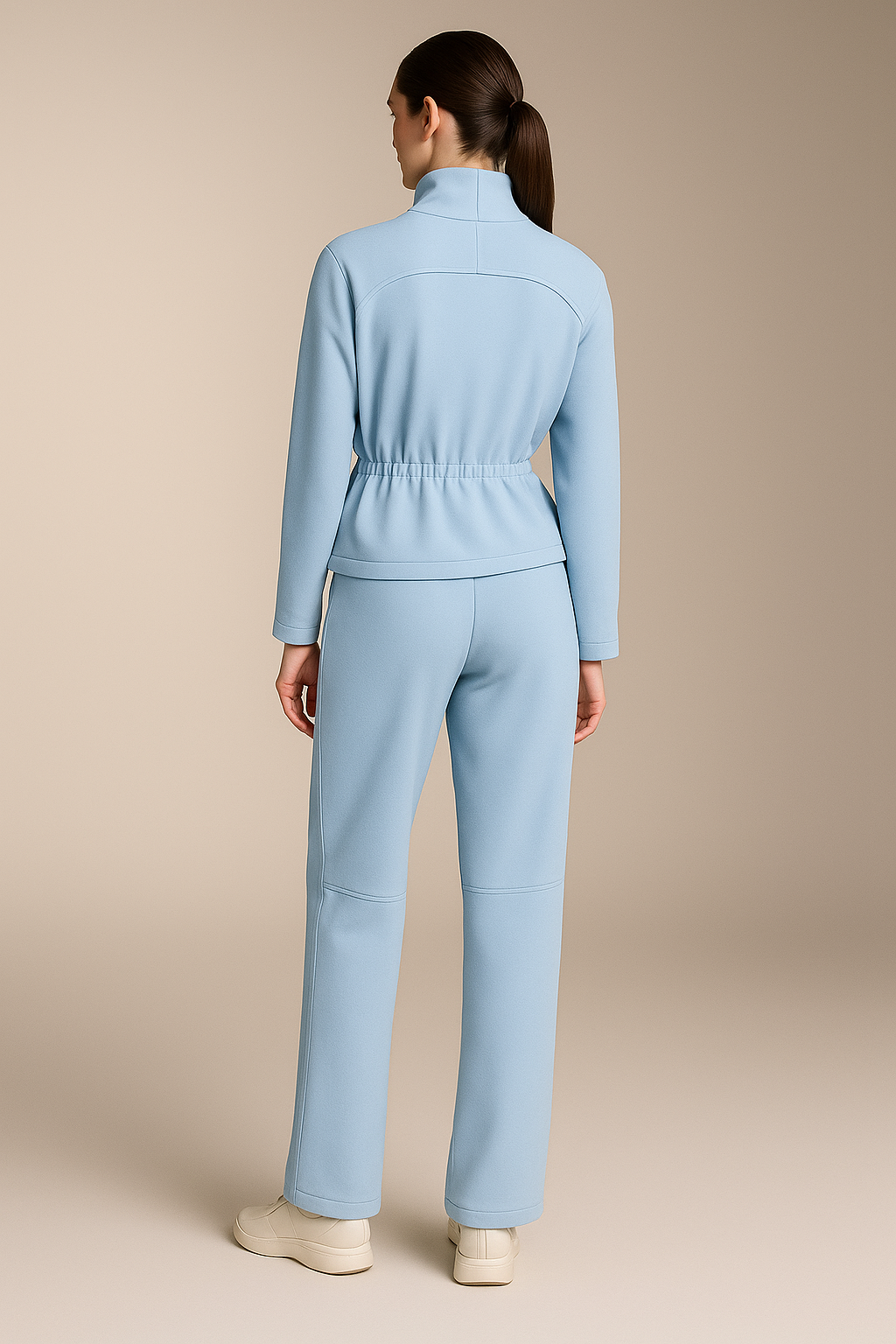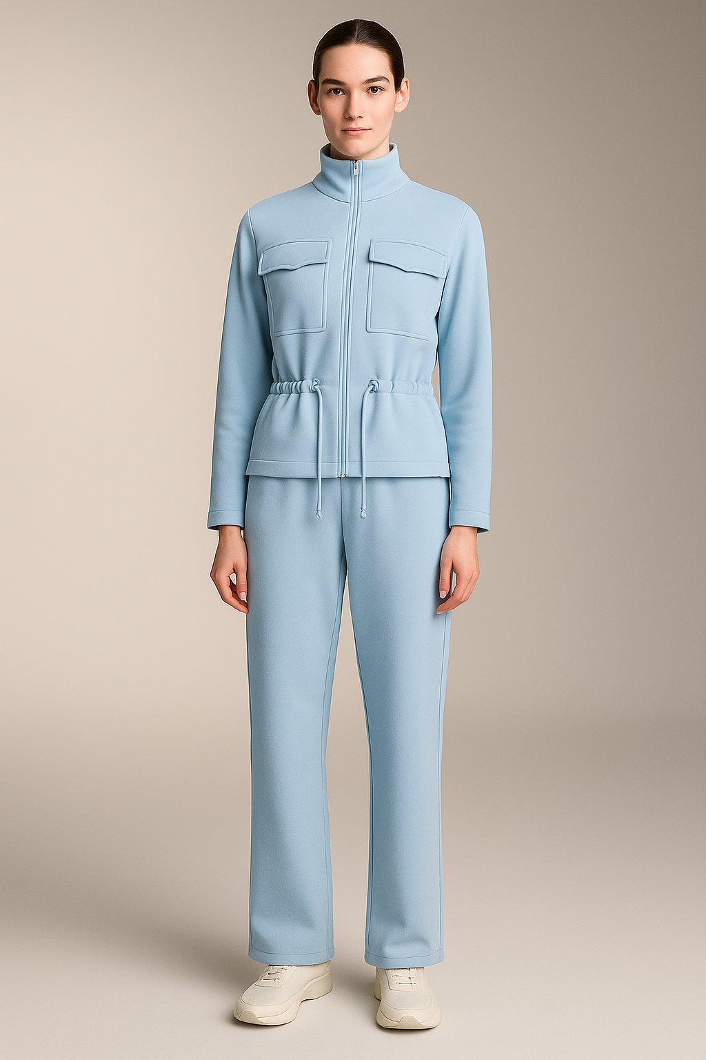 The jacket features a high-neck zip-up design, clean utility-style front flap pockets, and an adjustable drawstring waist that lets you contour the silhouette to your liking. Paired with straight-cut trousers that drape effortlessly, the ensemble delivers a sleek, elongated look without compromising comfort.